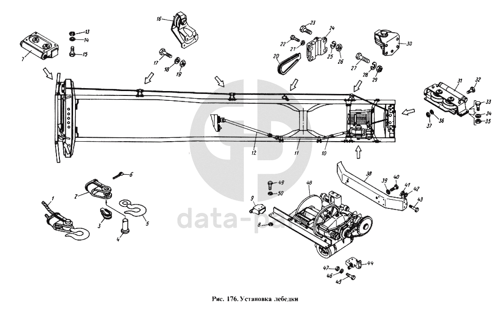Лебедка с редуктором, поперечиной и тросоукладчиком в сборе