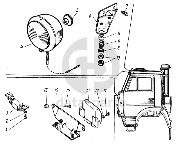 Прожектор, прерыватель указателей поворота и резистор факельного устройства облегчения пуска КамАЗ-43101