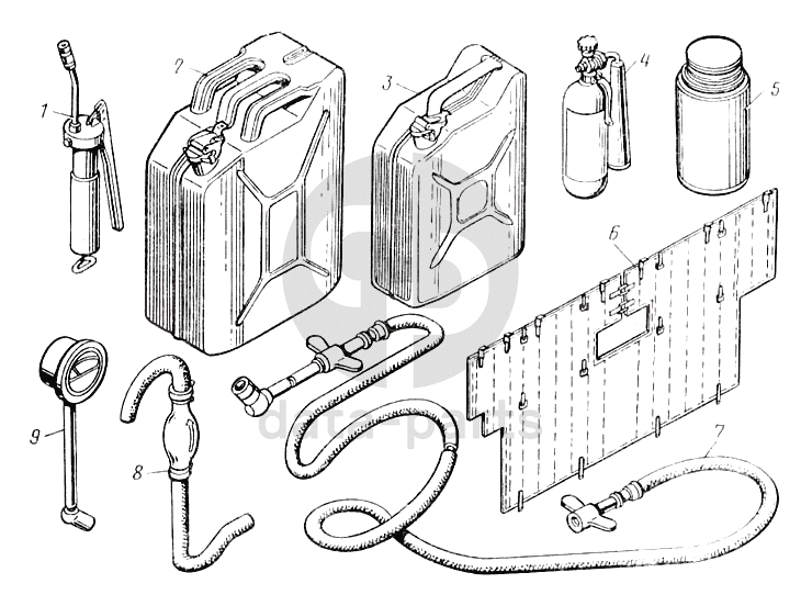 Шприц для смазки, канистры, огнетушитель, бачок, утеплитель передка, насос топливоперекачивающий и приспособление для накачивания шин