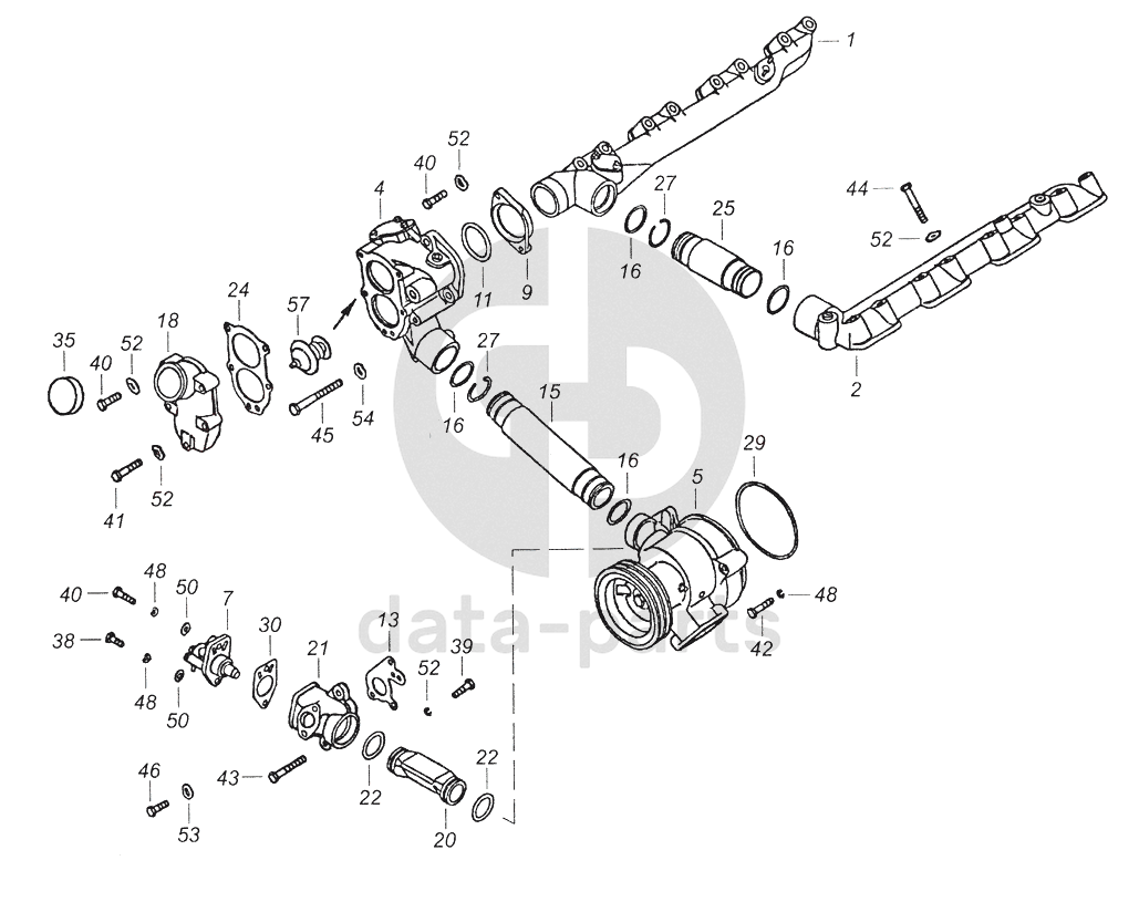 740.11-1303005-50 Установка водяного насоса, водяных труб и включателя гидромуфты КамАЗ-43261 (Евро-1, 2)