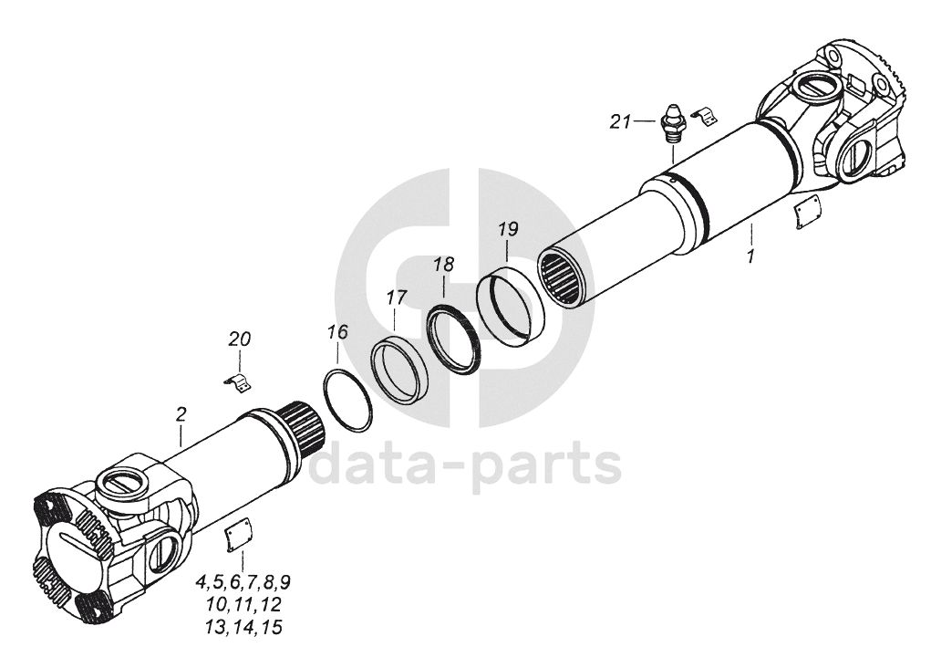 Вал карданный КАМАЗ среднего моста (4 отверстия торцевые шлицы) L=629мм