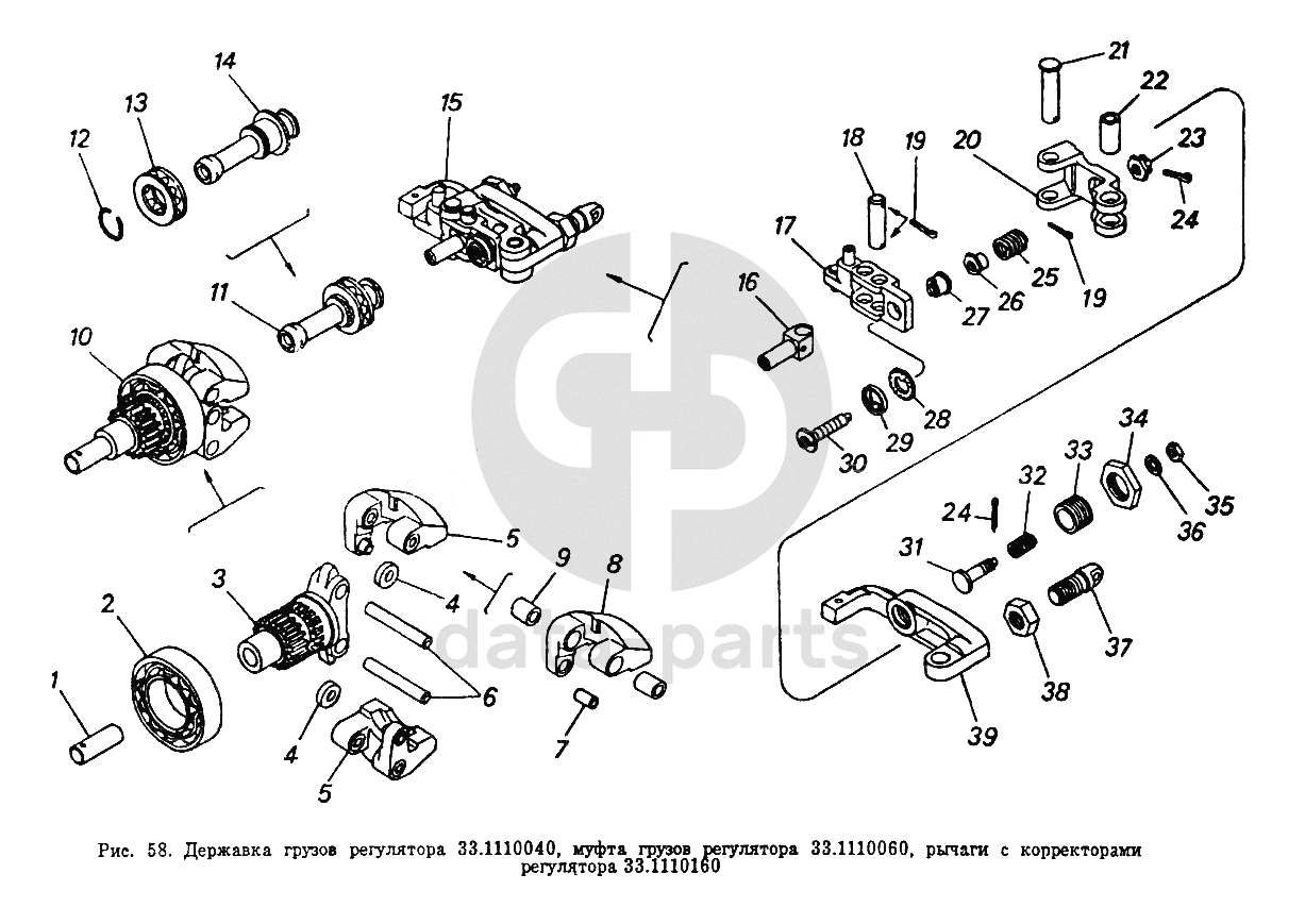 Державка грузов регулятора, муфта грузов регулятора, рычаги с корректорами регулятора