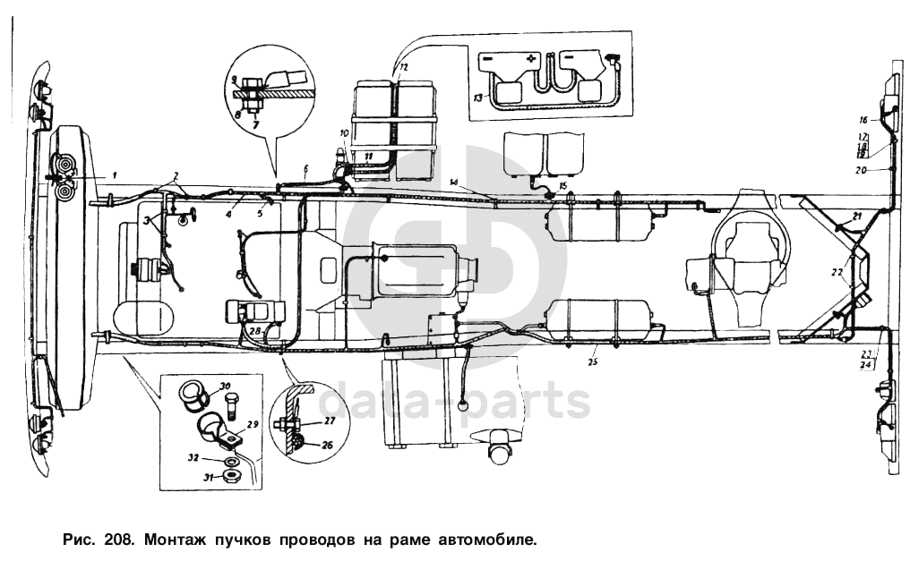 Монтаж пучков проводов на раме автомобиля КамАЗ-53212