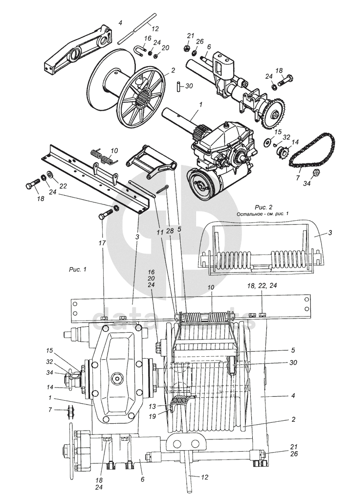 Лебедка с редуктором, поперечиной и тросоукладчиком