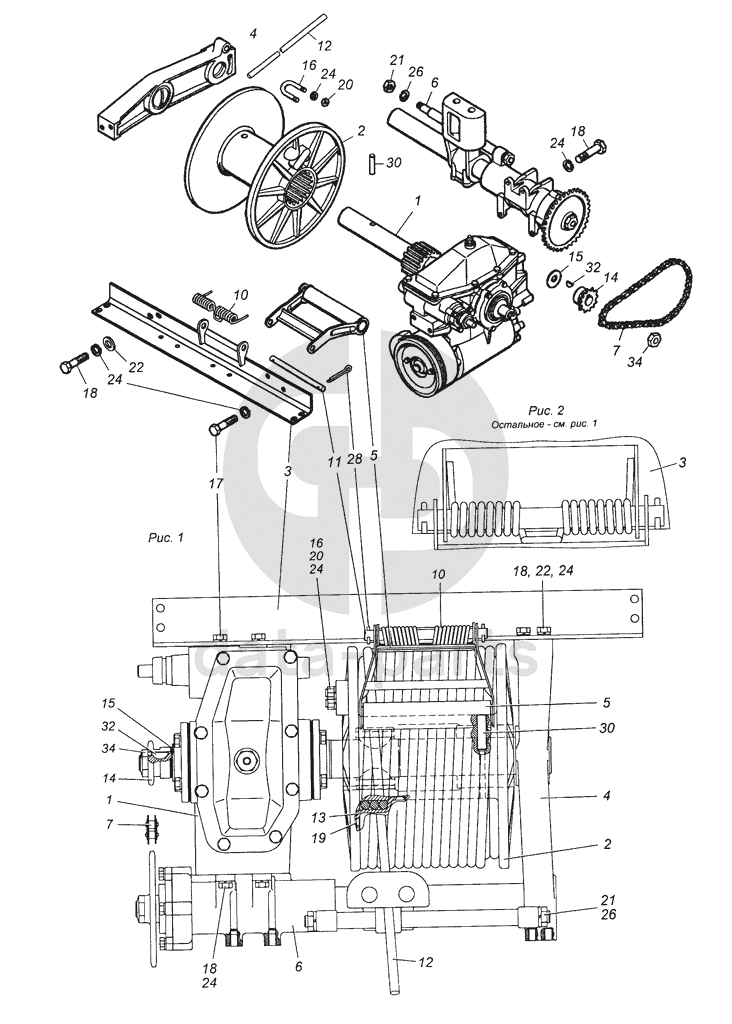 Лебедка с редуктором, поперечиной и тросоукладчиком