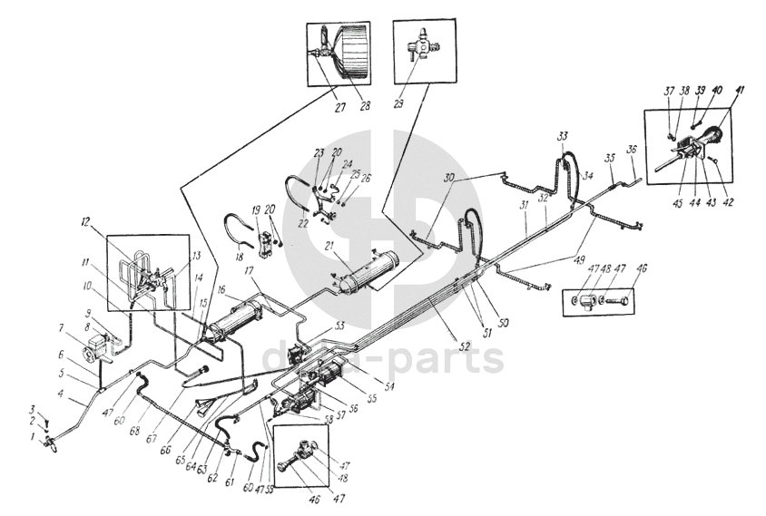 Схема пневмогидравлических тормозов автомобиля Урал-377 (Рис. 95)