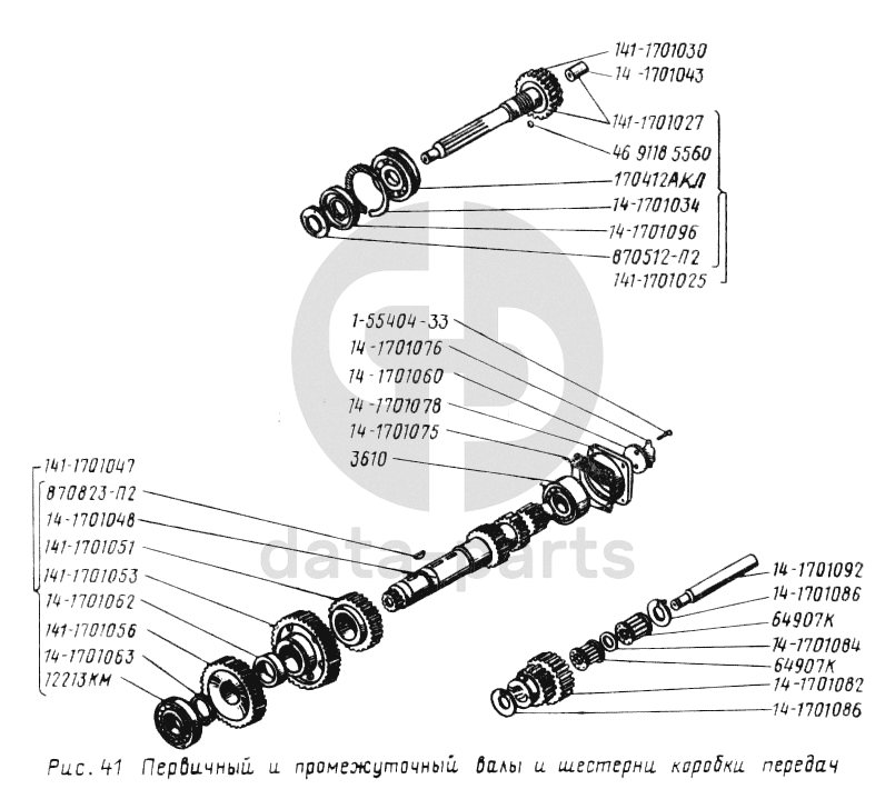 Первичный и промежуточный валы и шестерни коробки передач УРАЛ-5557