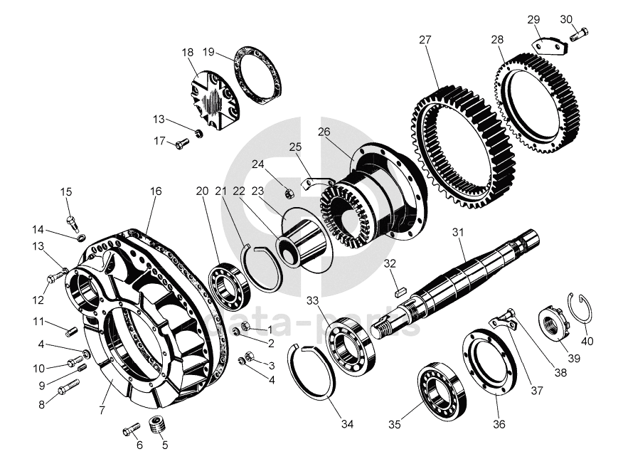 Детали бортового редуктора (кожух, полуось, подшипники, ступица, шестерни)