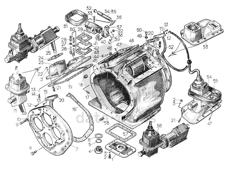 Корпус коробки передач с механизмами переключения, крышками и деталями крепления