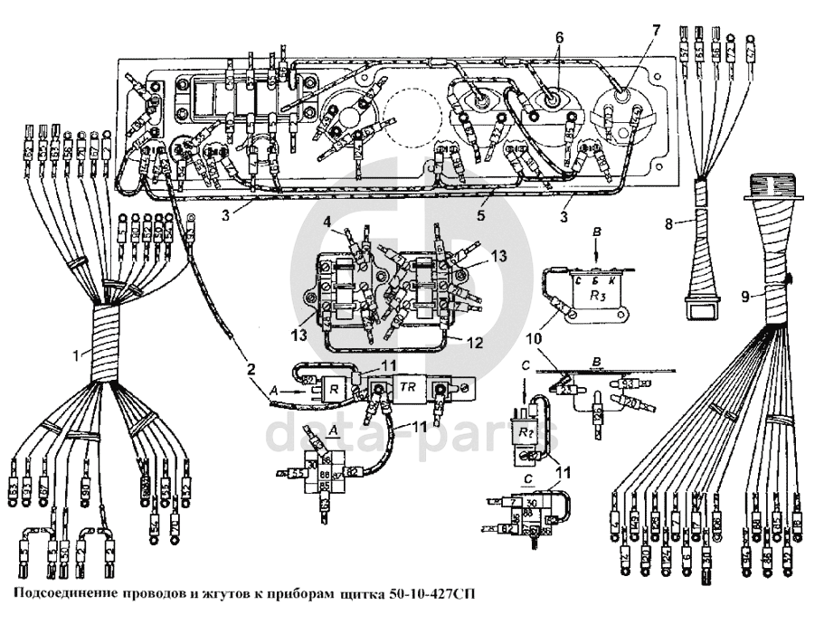 Подсоединение проводов и жгутов к приборам щитка 50-10-427СП
