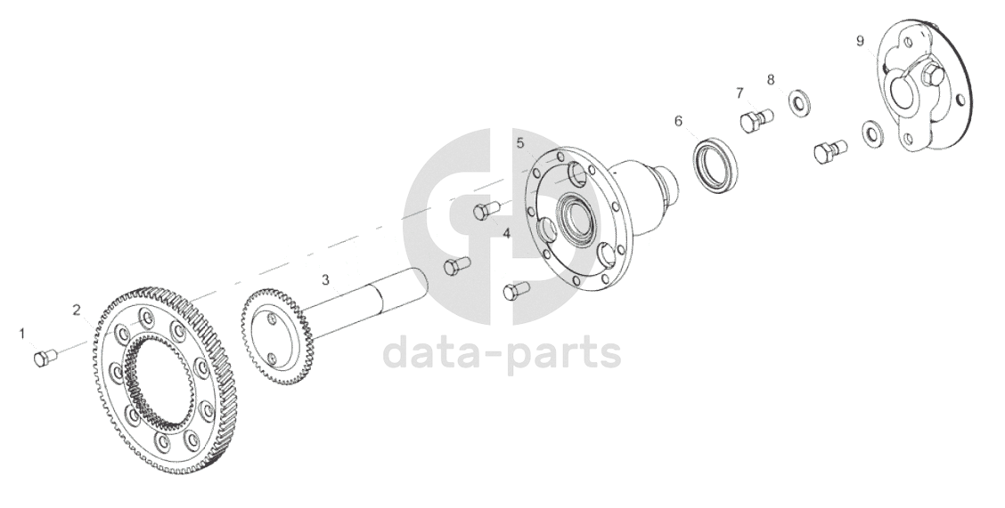 Ось ведомой шестерни с подшипником и маховиком в сборе
