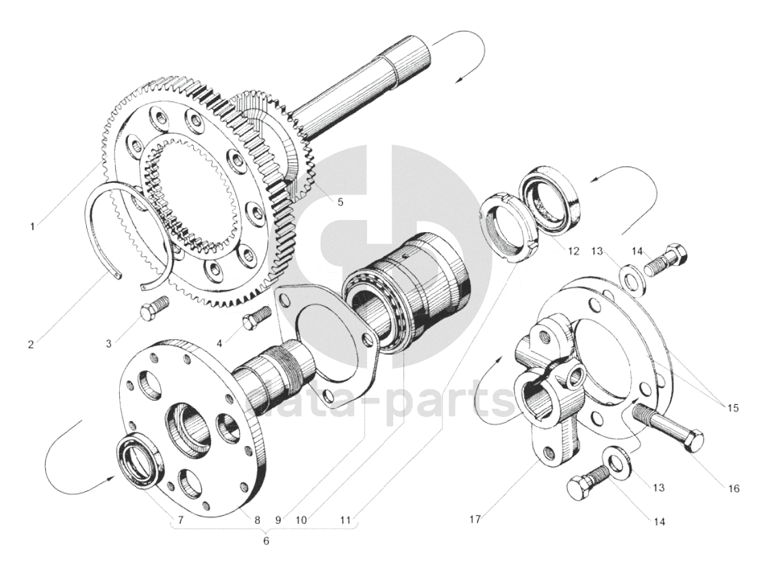 Ось ведомой шестерни с подшипником и маховиком в сборе