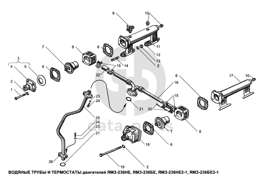 Водяные трубы и термостаты двигателей ЯМЗ-236НЕ, ЯМЗ-236БЕ, ЯМЗ-236БЕ2-1, ЯМЗ-236НЕ2-1