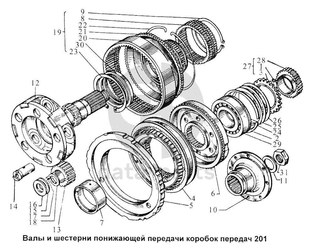 Валы и шестерни понижающей передачи коробок передач 201 ЯМЗ-238 ИМ