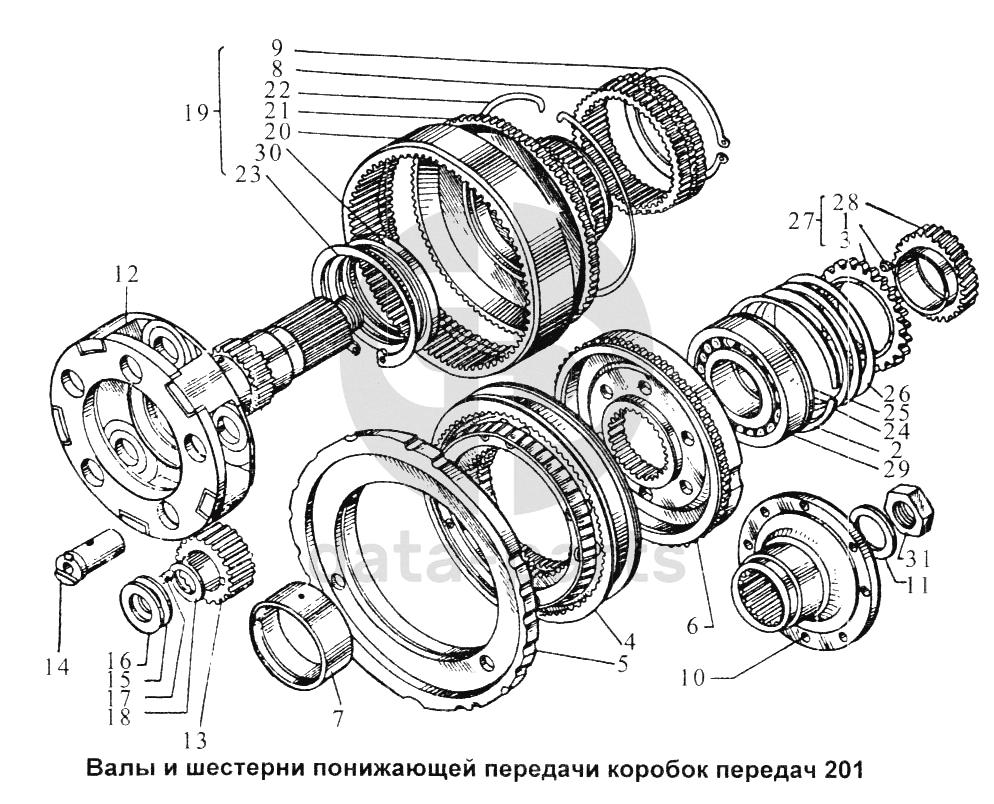 Валы и шестерни понижающей передачи коробок передач 201