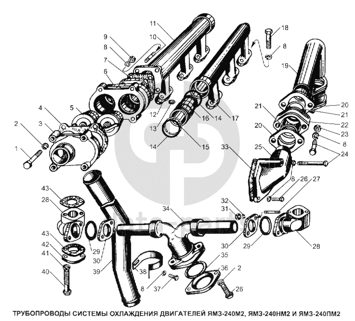 Трубопроводы системы охлаждения двигателей ЯМЗ-240М2, ЯМЗ-240НМ2 и ЯМЗ-240ПМ2