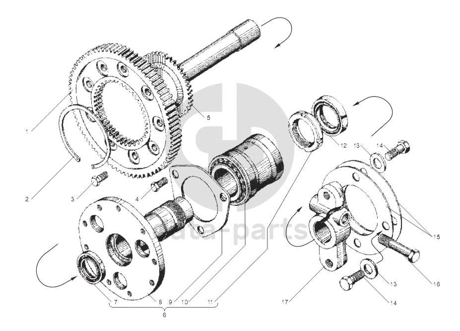 Ось ведомой шестерни с подшипником и маховиком в сборе