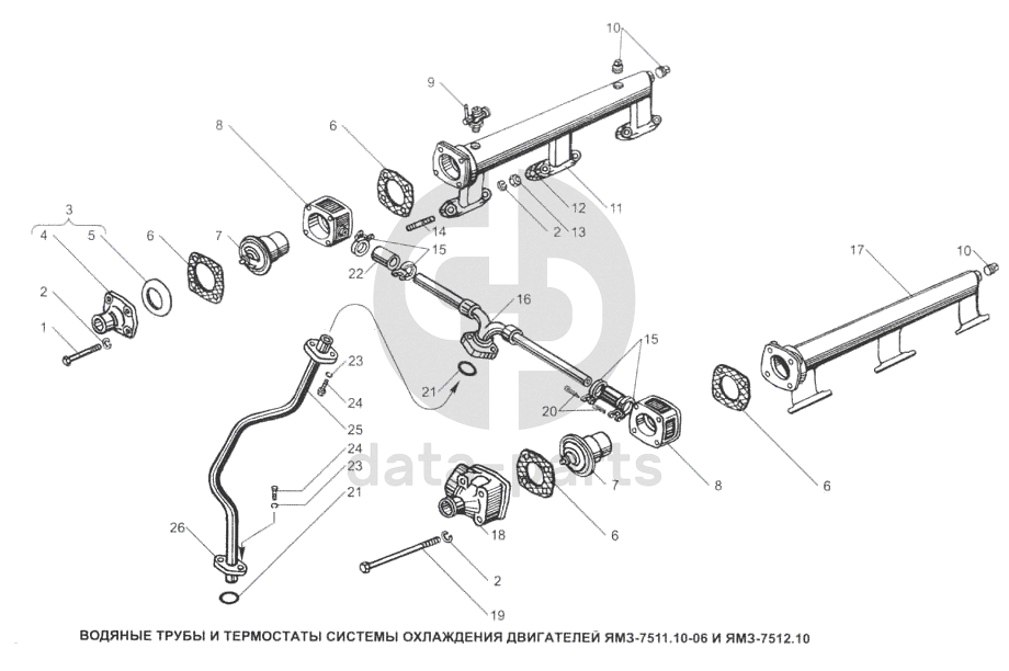 Водяные трубы и термостаты охлаждения двигателя ЯМЗ-7511.10-06 и ЯМЗ-7512.10