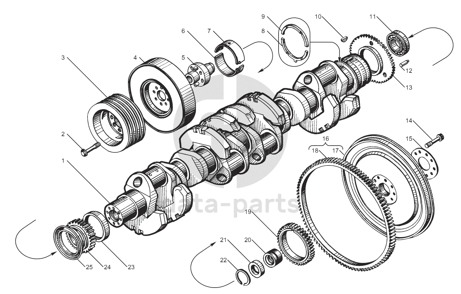 Коленчатый вал и маховик двигателей ЯМЗ-8502.10, ЯМЗ-8502.10-08, ЯМЗ-8503.10